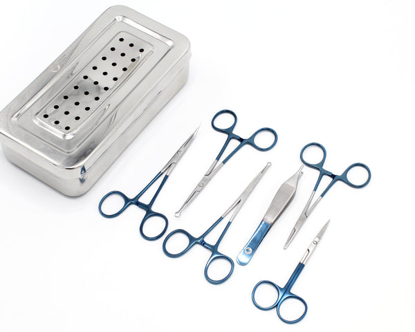 Kit avec 6 instruments : - Pince à anneau Ø 6mm avec mors biseautés - 14,50 cm - Pince moustique à embouts très fins - 14,50 cm - Pince à anneau Ø 4mm avec mors droits - 14,50 cm - Pince de Halstead - 12,50 cm - Ciseaux - 11,50 cm - Pince fine Adson avec griffes - 12 cm |