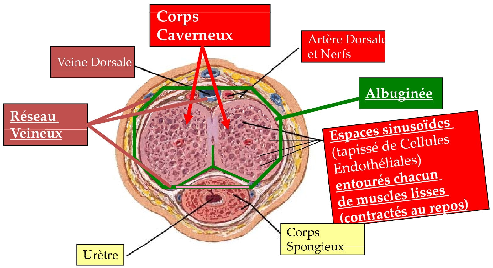 - Le sang artériel remplit l’espace sinusoïde des corps caverneux spongieux et leur gonflement comprime, partiellement, le retour veineux.